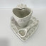INCLUYE:  1 TAZA FORMA DE CORAZÓN, 1 CUCHARA CORAZÓN, 1 PLATO FORMA CORAZÓN